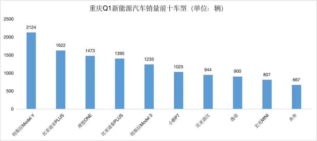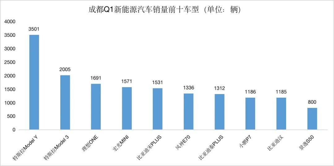 与前三个城市一样,一季度在成都销量最好的两个新能源汽车品牌也是比亚迪和特斯拉。前者的Model Y和Model 3都在成都一季度新能源车型销量前十之列,比亚迪的宋PLUS、秦PLUS和也位列其中。