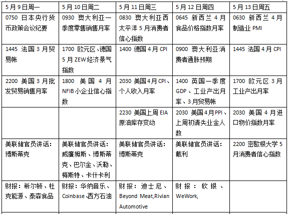 本周看点颇多,美国将公布4月消费者物价指数(CPI)预计增速将有所放缓,多位美联储官员将发表例行讲话。欧佩克将发布月度市场报告,欧盟可能对第六轮制裁令中涉及俄原油禁运提案进行表决,或引发原油市场波动。地缘政治方面,七国集团和北约外长会议将在德国召开,除聚焦乌克兰局势外,本次会议还将就芬兰和瑞典加入北约事宜进行讨论。美国总统拜登将于5月12日至13日在华盛顿举行美国-东盟特别峰会。