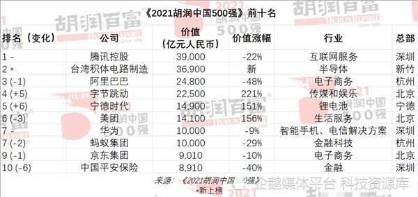字节跳动作为国内未上市的巨头,排行第四,还是相当不错的。另外一个特别要说明的是宁德时代,这家拒绝库克的企业在去年资产增值2.5倍,排名到了第五位。这也是宁德时代第一次进入前十名。