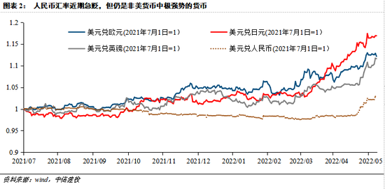 疫情后人民币汇率的走势可以大致分为三个阶段:2020年初至2021年7月(第一次降准前),人民币汇率与中美疫后经济复苏节奏高度一致;2021年7月后至2022年3月,人民币汇率在美元升值的大背景下,呈现出“美元强但人民币更强”的显著背离;2022年4月至今,人民币汇率急贬。