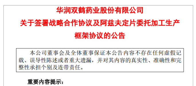 华润双鹤药业昨日宣布,与真实生物在北京签署了《战略合作协议》及《阿兹夫定片委托加工生产框架协议》。