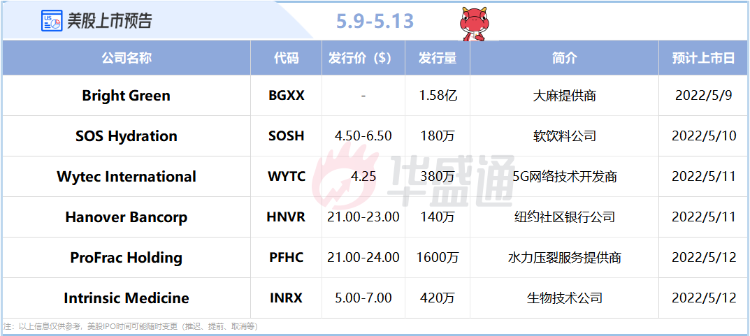 截至目前,本周暂时预计将有6只新股挂牌。其中大麻提供商BGXX将在纳斯达克直接上市。
