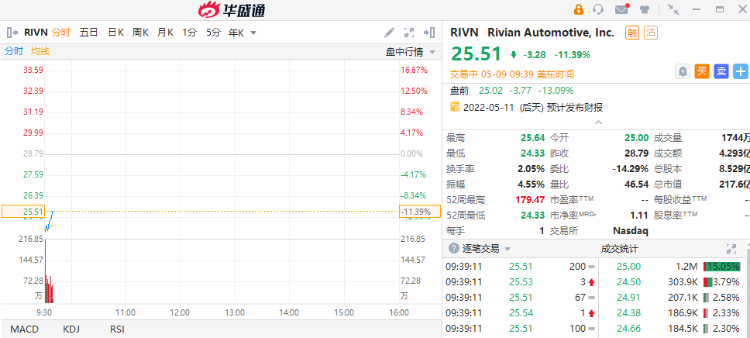 华盛资讯5月9日消息,美股盘初,新能源车板块集体下挫,截至发稿,Rivian跌超11%,报25.51美元。