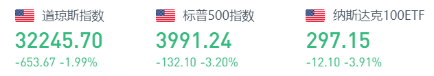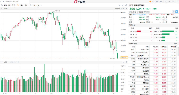 截至5月9日收盘,美国三大股指再度重挫。道指跌653.67点,跌幅为1.99%,报32245.70点;纳指跌521.41点,跌幅为4.29%,报11623.25点;标普500指数跌132.10点,跌幅为3.20%,报3991.24点。