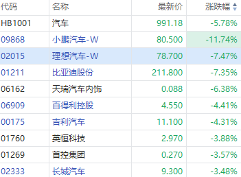 华盛资讯5月10日消息,港股汽车股今日跌幅居前,小鹏汽车-W现跌超11%,蔚来汽车-W跌超10%,理想汽车跌超7%,比亚迪股份跌超7%,吉利汽车跌超4%,长城汽车跌超3%。