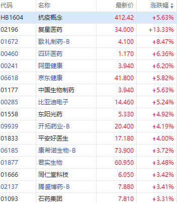华盛资讯5月11日消息,抗疫概念股盘中不断走强,复星医药大涨超13%,歌礼制药-B涨超8%,四环医药(00460)、京东健康、阿里健康涨超6%,中国生物制药涨超5%,开拓药业-B涨超4%,君实生物(01877)涨超3%。