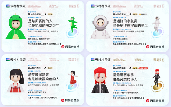 网易云音乐“发行“云村村民证”,打造有归属感的音乐社区。整支 H5 以领证的形式邀请用户领取自己的云村村民证。其中,最重要的证件本身,在设计上延用了日常生活中大家熟悉的正式证件样式,并加以创新。一方面,强调证件的正式感,另一方面,加入云村特有的卡通 IP 形象和音乐品味标签,形成云村特有的身份属性。在文案上,推翻之前的单一文案标签,打造双重身份标签,在文案内部形成差异和冲突,从而进一步丰富村民人设。另外,我们有意识地加入【居住地】、【口头禅】等强社交属性的内容,便于用户进行分享裂变。