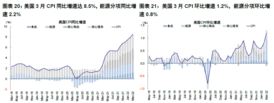 中金5月研报指出,俄乌局势导致的油价冲高是3月美国CPI大超预期的主要原因——能源价格给3月CPI环比(+1.2%)贡献了0.8%的增长率、给3月CPI同比(+8.5%)贡献了2.2%的增长率)(图表20~21)。如果扣掉这一因素,美国CPI可能在3月就已经迎来拐点。