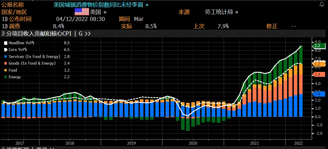 这与彭博调查预期相一致。彭博调查预期显示,美国4月CPI同比增速预计为8.1%;不包括食品与能源的CPI(即核心CPI)的同比增速预计为6.0%。环比方面,美国4月CPI环比增速预计为0.2%(3月份公布值为1.2%);不包括食品与能源的CPI环比增速预计为0.4%(3月份公布值为0.3%)。