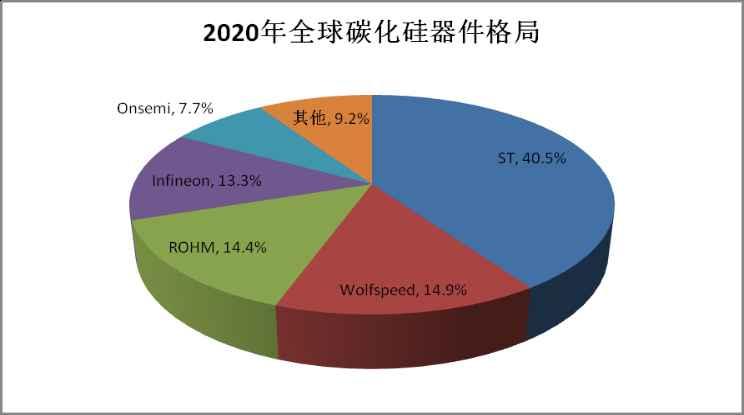 器件端基本全是外资的天下,根据Yole的数据,2020年,ST、Wolfspeed、ROHM、Infineon、Onsemi的市占率分别为40.5%、14.9%、14.4%、13.3%、7.7%,CR5吃掉了超90%的市场。