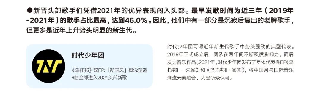 白皮书里,周深的成绩很是亮眼。2021年,他发行超过50首新歌,平均每周就出一首。这50多首歌里,有六成进入全年头部歌曲行列,周深去年的个人作品播放量也较2020年上升55.6%。