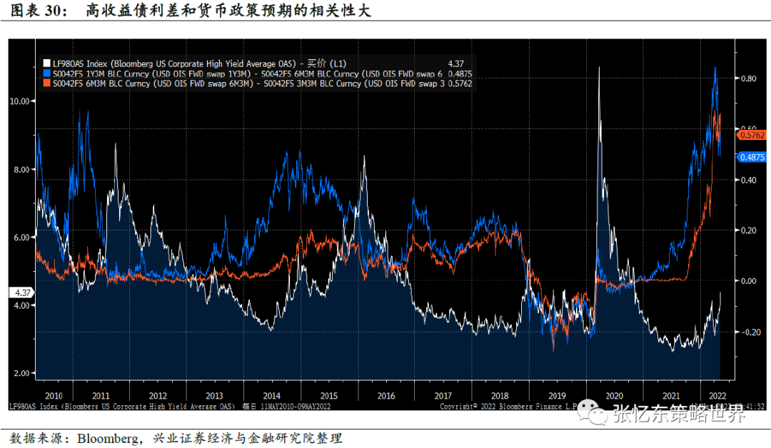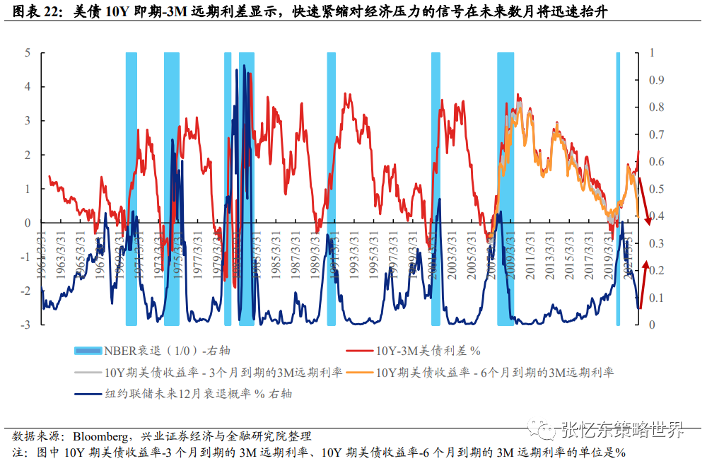 虽然当前10Y-3M利差所隐含的衰退概率依然较低,但是随着联储进入快速紧缩阶段,10Y-3M利差会迅速缩窄,把3个月美债即期利率替换成远期利率,截至4月29日,10Y美债-6个月到期的3M远期美债利差仅0.16%。也就是说,快速紧缩对经济压力的信号在未来数月迅速抬升。