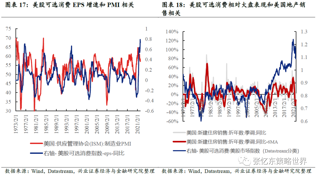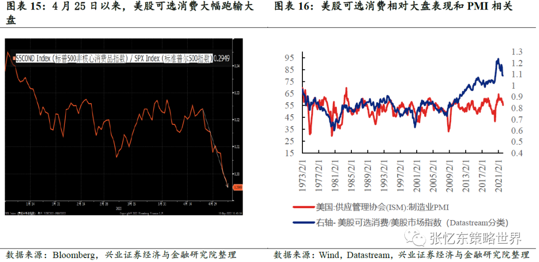 4月底至今美国经济动能回落的迹象初现,美股开始交易经济转弱。4月美国制造业PMI由前值的57.1回落至55.4,3月美国房屋销售反季节性回落。因此,4月25日以来,美股可选消费大幅跑输大盘。历史上,美股可选消费的相对走势与反映美国宏观经济动能的PMI、房地产走势具有明显的相关性。