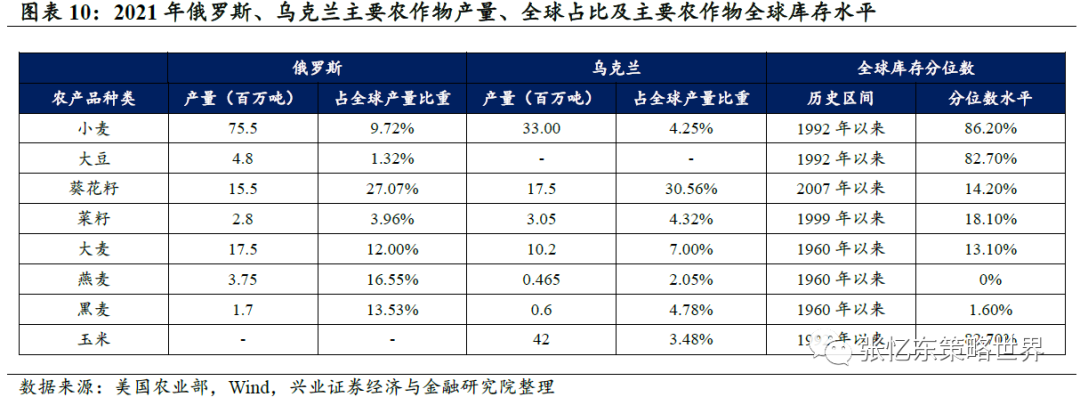 俄乌农产品在全球供应中同样占据重要地位。从农产品产量来看,2021年俄乌小麦产量合计占全球产量的14%,葵花籽的全球占比为57.6%,大麦、燕麦和黑麦的全球占比分别为19.0%、18.6%和18.3%。乌克兰的玉米产量全球占比约为3.5%。从出口数据来看,俄乌地位更为重要,以小麦为例,根据联合国粮农组织数据,2019年俄罗斯小麦出口占全球出口量的17.8%,为全球最大的小麦出口国,乌克兰为7.4%,合计占比超过1/4。