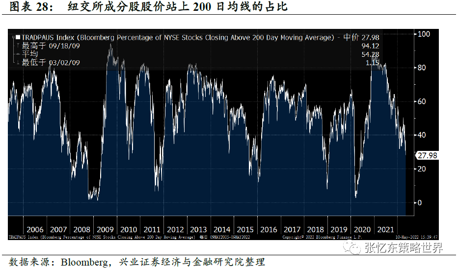 动量转弱指标,纽交所股票股价站上200日均线占比可作为衡量,当该指标大幅下探,意味着前期的强势股也开始补跌;截至5月9日,该指标为28.0%,这一水平相比历次美股的大跌时的低点尚不极端。2020年3月为6.9%,2018年12月为14.4%,2015年9月为18.8%,2011年9月为9.9%。