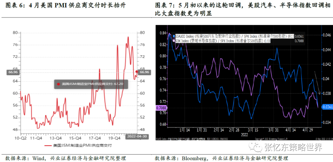 4月美国PMI供应商交付时长抬升,中国疫情的影响也可能会加大全球供应链压力,不利于高度依赖全球供应链的美国公司,增强了美国高通胀持续的预期。5月FOMC会后声明里谈到“中国与COVID相关的封锁可能会加剧供应链中断”,4月PMI制造商交付指数从3月份的65.4升至67.2,或指向这一潜在担忧的迹象。5月初的这轮回调来看,费城半导体指数、标普500汽车及配件行业指数相比于标普500指数明显跑输。