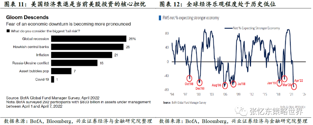 虽然现在美国经济其实还行,但是,根据4月美国银行做的基金经理调查,衰退是市场的头号担忧,意味着任何指向衰退叙事或者经济动能转弱的迹象都会带来抛售压力。根据美国银行(BofA)近期发布的4月上旬针对292位管理人、合计管理规模达到8330亿美元的调查显示,基金经理当前对于衰退担忧的程度甚至超过了2020年3月、2019年1月。