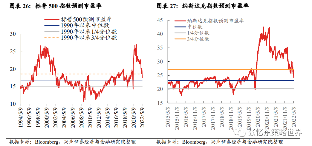 第三,在缩表和加息的叠加紧缩效应之下,美债收益率上行空间或超预期。我们基于历史研究做一个线性测算,未来12个月缩表的紧缩效应相当于加息50bp(详参20220503《乍暖还寒,战略相持阶段有望展开》)。当前,相比于名义利率,实际利率上行空间可能更大。在美股估值依然不便宜的情况下,美债收益率继续上行压缩估值或还有空间。截至5月9日,标普500指数预测市盈率为17.5倍,位于1990年以来的中位数水平和3/4分位数之间;纳斯达克指数预测市盈率为24.2倍,位于2002年以来的中位数水平和3/4分位数之间。