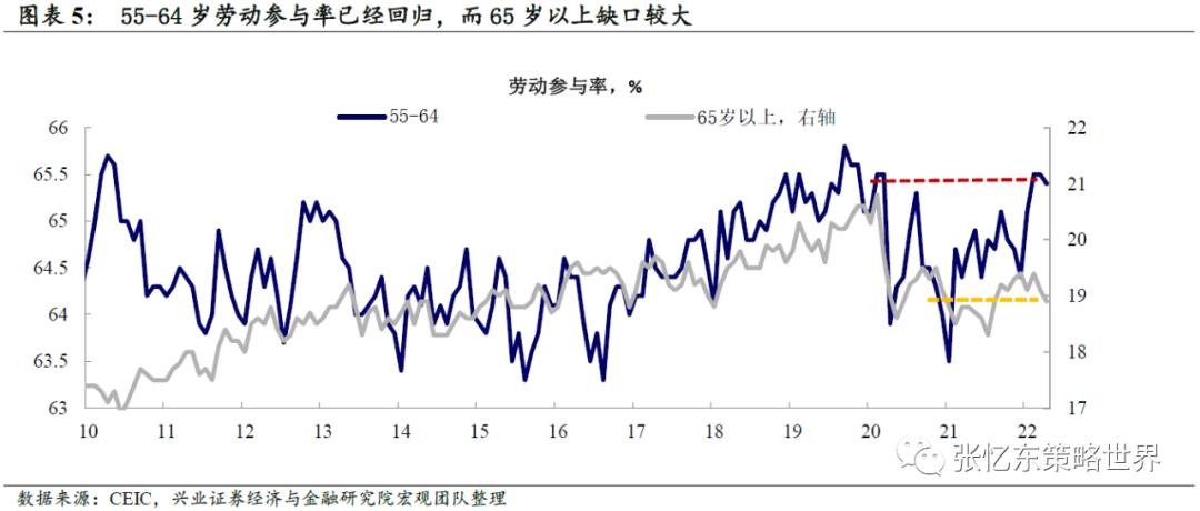 4月底至今,劳工成本、劳工生产率、非农就业数据连续披露,其所反映的工资-通胀螺旋的预期被不断强化。1)4月底披露的1季度美国雇佣劳动力成本同比增4.5%,前值是4.0%,显示出近期通胀压力已经转移到劳动力成本上;2)5月初披露的1季度劳动力市场数据显示:近期劳动力成本/劳动力生产率指数走高;3)5月初披露的4月非农数据显示,55-64岁劳动参与率已经回归,而65岁以上缺口较大。