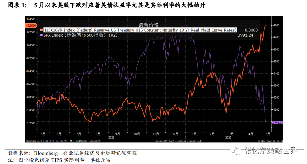 2.1、美联储很鹰,5月以来美股下跌对应着实际利率的大幅抬升,跟2018年四季度一样