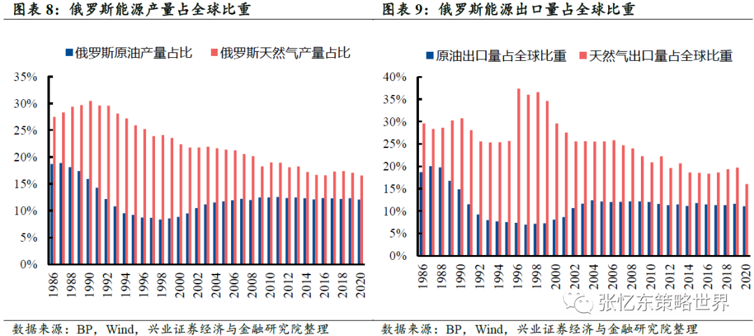 俄罗斯是全球重要的油气生产国和出口国。2020年俄罗斯原油产量为1066.7万桶/天,占全球原油产量的12.1%,出口占比达到11.1%;天然气产量占全球产量的16.6%,出口占比达到16.1%。