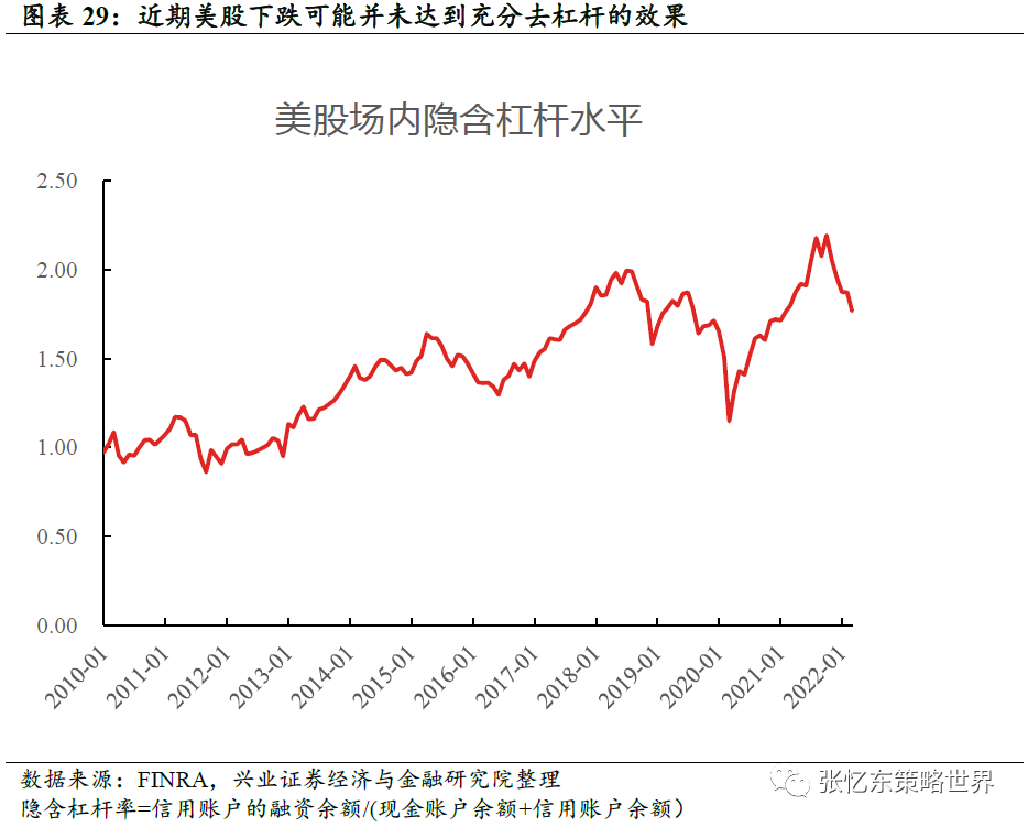美股杠杆水平,可以参考FINRA每月披露的美股隐含杠杆率,最新3月数据尚未显著回落。截至2022年3月底,美股隐含杠杆率水平为1.77,大幅高于2020年3月的1.15,也较明显高于2018年12月的1.58。(注:隐含杠杆率=信用账户的融资余额/(现金账户余额+信用账户余额))