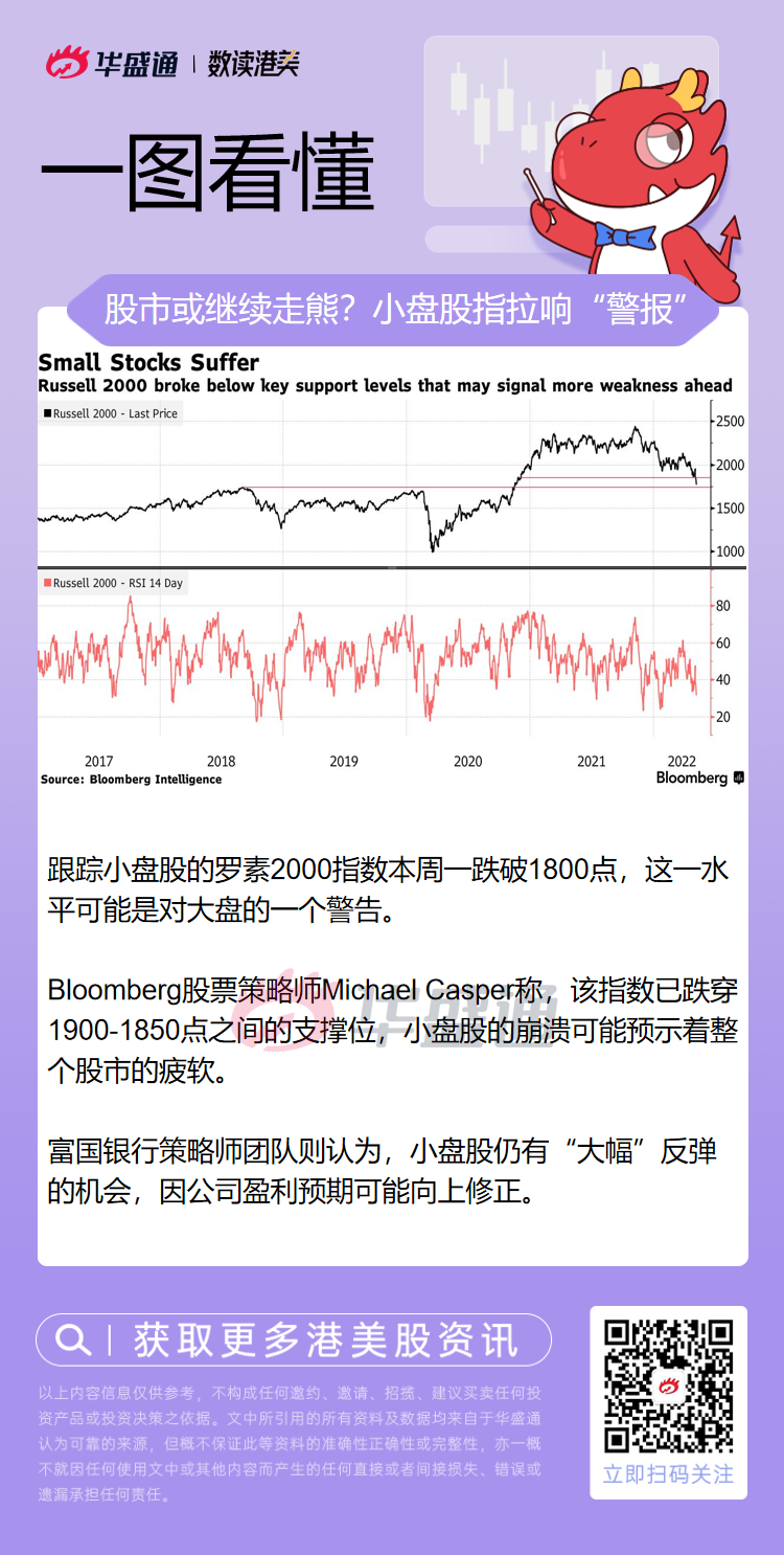 跟踪小盘股的罗素2000指数本周一跌破了1800点,这一水平可能是对大盘的一个警告。Bloomberg Intelligence股票策略师Michael Casper在一份研究报告中写道,随着该指数周一下跌4.2%至1762点,交易员们现正密切观察该指数能否守住1740点,这是该指数2018年创下的当时的历史新高。
