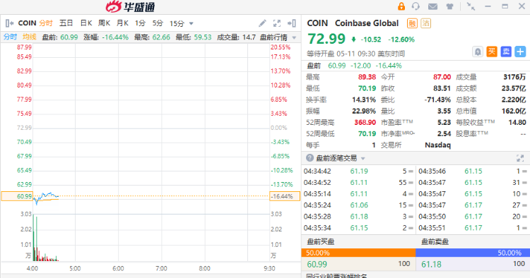 CoinbaseQ1净营收为11.65亿美元,较上年同期15.97亿美元下降27.05%,市场预期为14.8亿美元。同时该公司警告称,预计二季度的总交易量将低于第一季度。截至北京时间16:35,Coinbase盘前跌超16%。