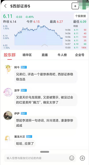 一系列风波之下,西部证券被股民吐槽为2022年“最惨券商”。在尺度西部证券股东群,有股民表示,“评选一个最惨券商吧,西部证券稳稳当选”、“又是天价乌龙现眼,又是被警示,被没过会的红星美羚“捅刀”,确实太惨了”。