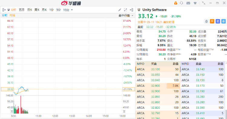 智通财经APP获悉,5月11日(周三),Unity Software(U.US)股价暴跌,最低触及30.3美元,创上市以来新低。截止发稿,该股跌超31.19%,报33.12美元。该公司Q1净亏损同比扩大至1.78亿美元,Q2及全年指引不及市场预期。