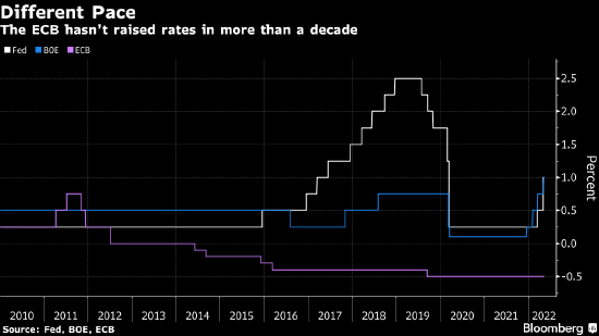 上周,法国央行行长Francois Villeroy de Galhau公开赞同这一前景,称今年加息至零以上是“合理的”。比利时央行行长Pierre Wunsch上月接受采访时表示,这“是明摆着的”情景。