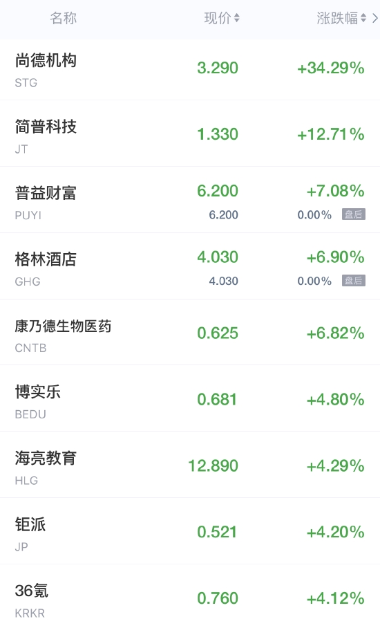 尚德机构涨超34%,瑞幸粉单涨超10%,36氪涨超4%,满帮涨超3%,理想汽车涨超2%,携程涨近2%,雾芯科技、中通、极光涨超1%。