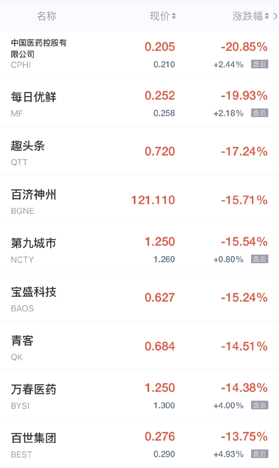 领跌中概股列表:
