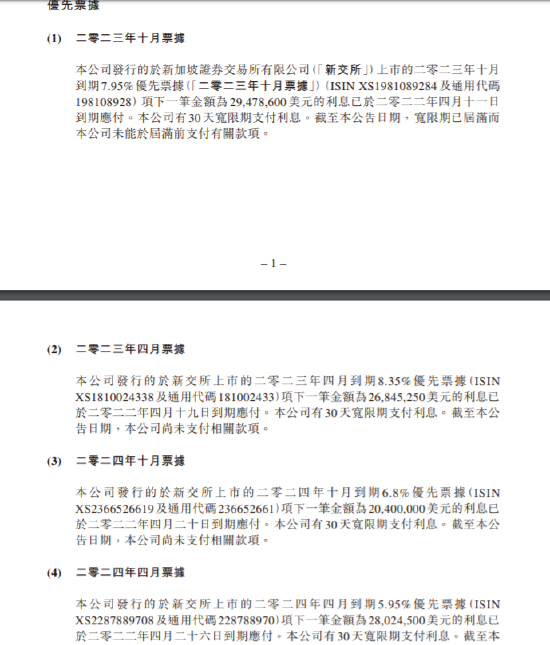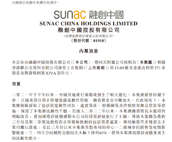公司说明了违约背景,二零二一年下半年以来, 中国房地产行业环境发生了较大变化。 集团销售持续下滑,且随着部分房企陆续暴露流动性问题,融资难度亦不断加大。在此情况下,集团积极采取了包括促进销售回款、 处置资产、 股权融资及控股股东无息借款等措施,保证了本集团流动性平稳。但进入二零二二年以来,集团融资情况未能得到明显改善, 叠加国际评级机构对本公司的投资评级进行了下调, 导致本集团为应对 三月份及第二季度流动性需求所积极推动的包括资产处置、 专项融资等多种资金方案均难以落地;并且三月份以来本集团重点布局的核心一二线城市的销售受疫情影响严重,三、四月合同销售金额同比大幅下降约65%,使得本集团现阶段面临着更大的流动性压力。