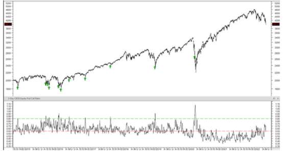 Leuthold Group首席投资官Doug Ramsey称这是他的“荒岛情绪指标”。为了消除波动性,他追踪了三天的平均值。自2014年以来,当该比率移动到0.85或更高时,就会出现抛售底部,如下图所示。而最近是0.7左右,所以还没到时候。