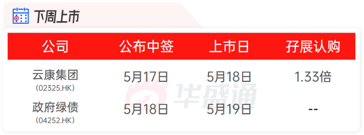 云康集团为国内领先的医学检测机构,公开发售孖展录得1.33倍认购,将于下周二(5.17)公布中签结果,次日正式挂牌港股上市。