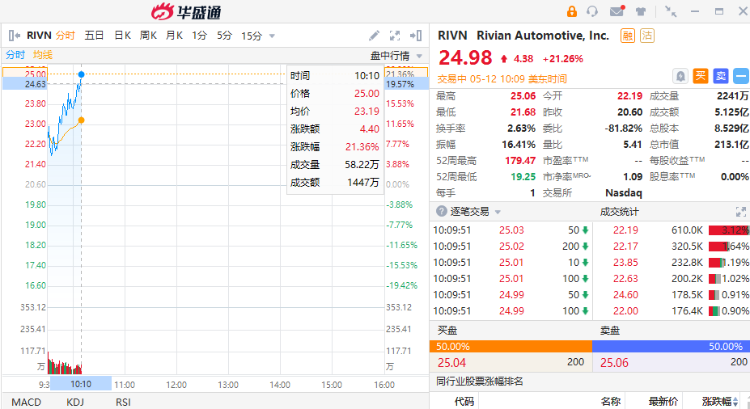华盛资讯5月12日消息,美股盘初,Rivian逆市上扬,截至发稿,现涨21.26%,报24.98美元。