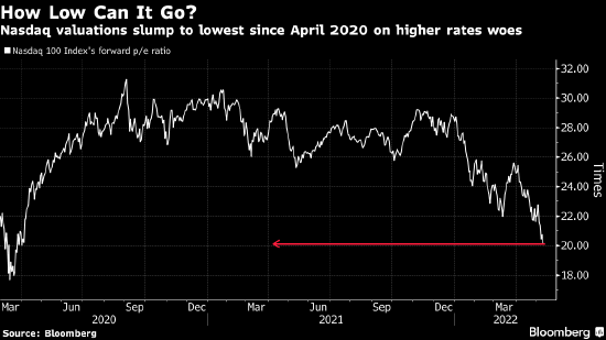 根据数据,纳斯达克100指数目前的预期市盈率约为20倍,为2020年4月以来最低水平,也大致是过去十年的平均水平。相比之下,去年11月该指数创下纪录高位时约为29倍。