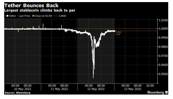 近日,随着加密货币市场第三大稳定币TerraUSD(即UST)的暴雷,币圈市场也因此风声鹤唳。美东时间周四,全球最大稳定币Tether(USDT)也一度失去与美元1:1的挂钩,最多跌至94.55美分。为2020年12月以来的最低水平。