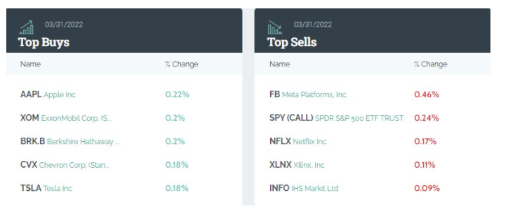 根据SEC披露,全球最大资管公司贝莱德递交了截至2022年3月31日的第一季度持仓报告。从持仓比例变化来看,前五大买入标的分别是:苹果、埃克森美孚、伯克希尔-B、雪佛龙、特斯拉。前五大卖出标的分别是:Meta 、标普500指数ETF看涨期权、奈飞、赛灵思、IHS MARKIT LTD。