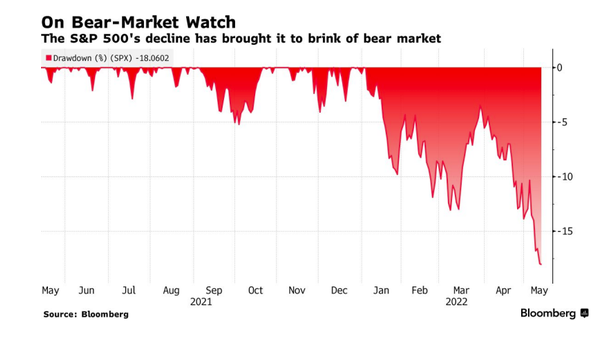 标普500指数周四收跌0.1%,本周已下跌4.7%,自1月3日创下历史高点以来的跌幅达18%,接近20%的跌幅让市场大为震惊,对经济来说是个不祥之兆。该指数周四一度下跌1.9%,离陷入技术性熊市仅有30点之差。美联储遏制通胀的举措将令经济陷入衰退的可能性日益增强,这令股市在18周内缩水近10万亿美元。