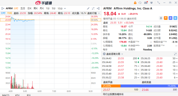 Affirm第三财季业绩超预期,期内营收同比增长54%至3.55亿美元,超过市场预期的3.44亿美元;第三财季GMV为39亿美元,同比增长73%;总交易量增长至1050万笔,同比增长162%。截至北京时间17:39,该股盘前涨超30%。