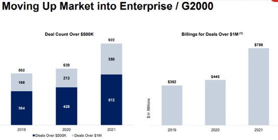 由于FTNT对于安全厂商来说具有罕见的SD-WAN功能,并且将所有网络/安全功能打包到一个盒子中,并且能够提供Gartner对SASE的定义,如前所述,该公司吸引了对混合用例的大量需求。由于大型企业往往拥有最复杂的混合用例,在过去几年中,FTNT越来越多地渗透到高端市场。