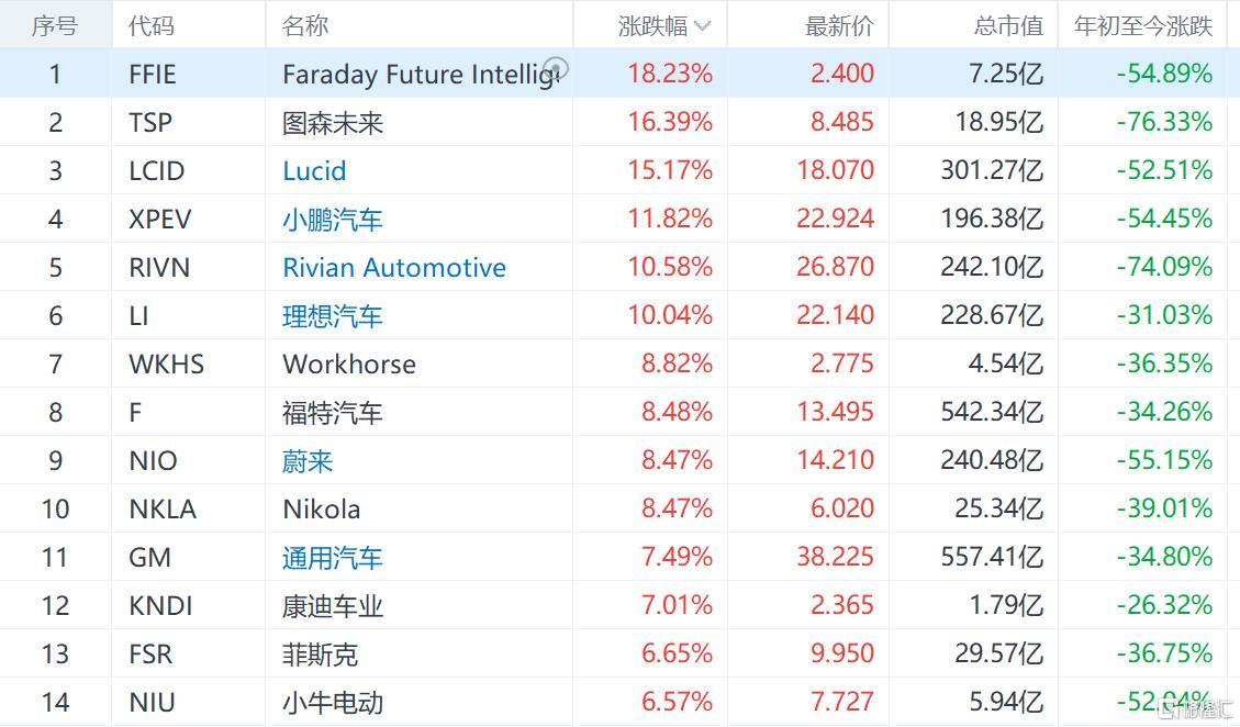 格隆汇5月13日丨新能源车股集体上涨,图森未来涨16%、Lucid涨15%、小鹏汽车涨11%,Rivian、理想汽车涨10%,福特、蔚来涨8%,通用汽车涨7%。