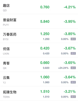 房天下跌超14%,触宝、趣店跌超4%,人人公司、兰亭集势、红黄蓝跌超1%。