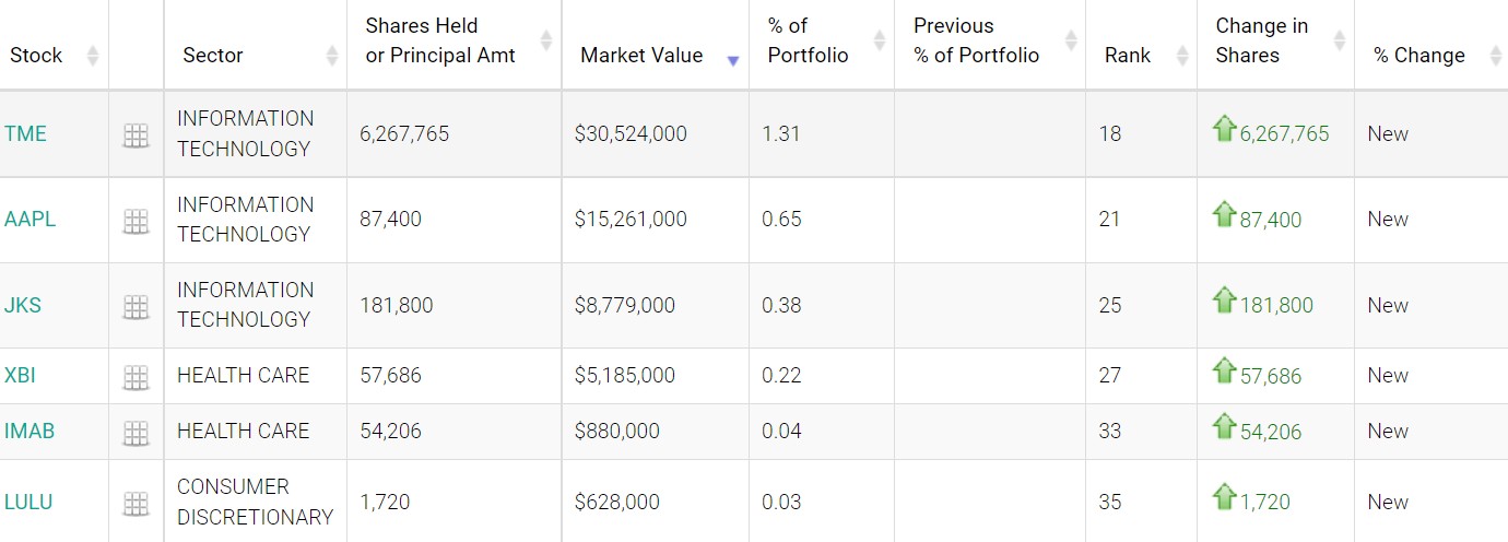 值得注意的是,景林第一季度新建仓腾讯音乐(TME.US)、苹果(AAPL.US)、晶科能源(JKS.US)、标普生物科技ETF(XBI.US)、天境生物(IMAB.US)以及露露柠檬(LULU.US)。