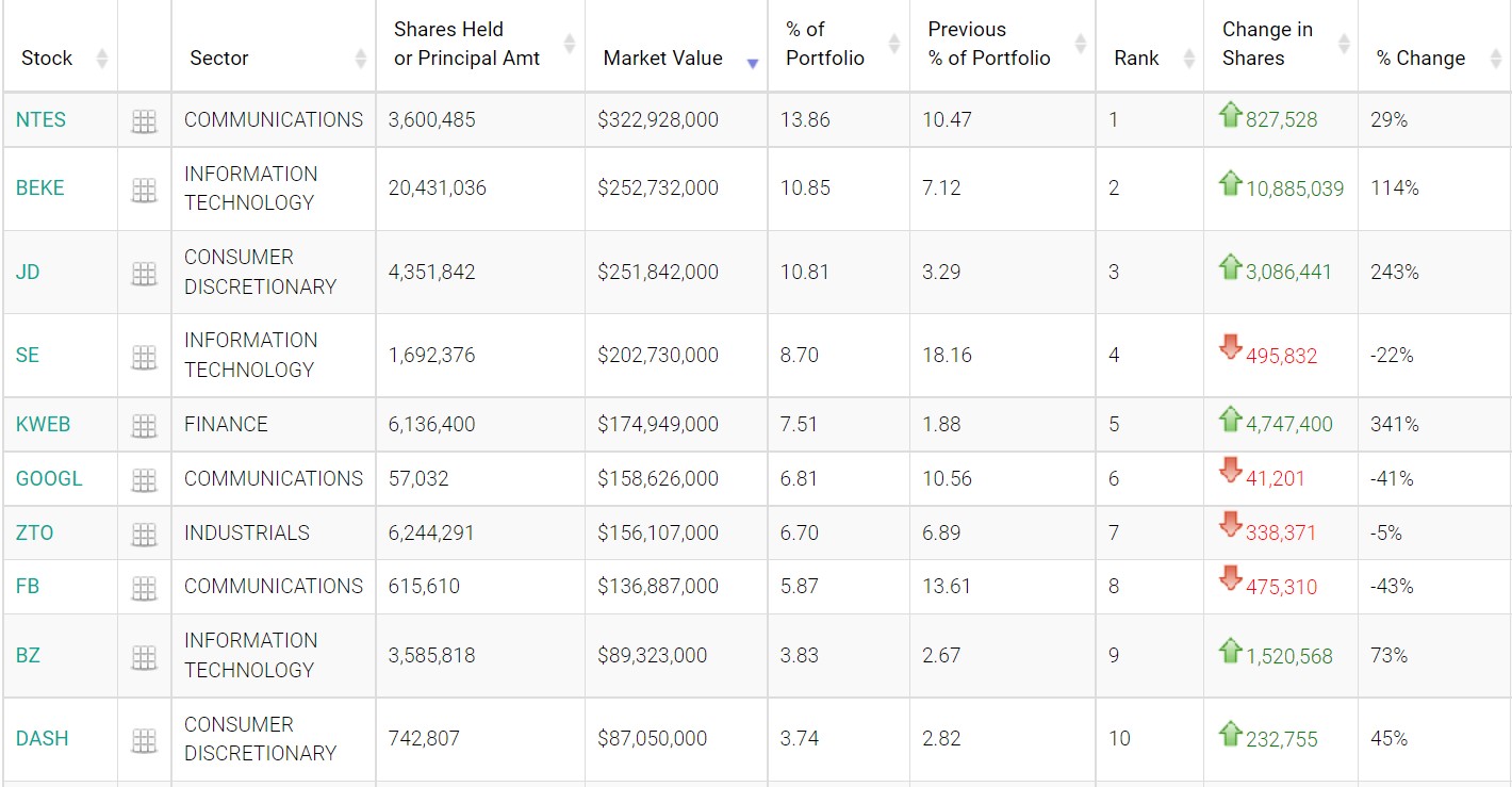在前十大重仓股中,网易(NTES.US)位列第一,持仓约360万股,持仓市值约3.23亿美元,占投资组合比列为13.86%,较上季度持仓数量增加29%。