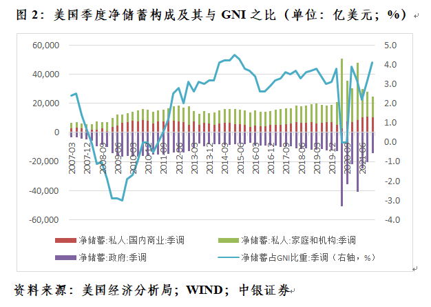 从存量比存量的维度看,到2021年底,美国净储蓄与GNI之比为4.1%,改变了2008年初至2010年二季度净储蓄率持续为负的状况,处于2007年初以来的91.5%分位。从美国净储蓄的构成看,2020年一季度至2021年四季度,季均净储蓄5948亿美元,其中:居民和非营利机构部门贡献了25779亿美元,私人商业部门贡献了7896亿美元,政府部门为负净储蓄27726亿美元(见图2)。