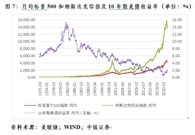 目前看来,后一种情形发生的可能性并不低。对1971年3月至2022年4月月均道琼斯工业平均指数、标普500指数、纳斯达克综合指数和月均10年期美债收益率取自然对数,然后将三大股指与10年期美债收益率分别做相关性分析显示,分别为强负相关0.842、0.825和0.822(见图7)。虽然最新公布的4月份美国CPI通胀数据为8.3%,环比回落了0.2个百分点,但高于市场预期的8.1%,显示美国通胀下行的前景并不乐观。若迫于通胀持续高企的压力,美联储超预期紧缩,有可能触发风险资产价格(甚至包括房价)更大幅度的调整。实际上,5月11日公布最新通胀数据后,美股应声下跌。至此,前述三大股指年内分别累计下跌12.4%、17.4%和27.4%。
