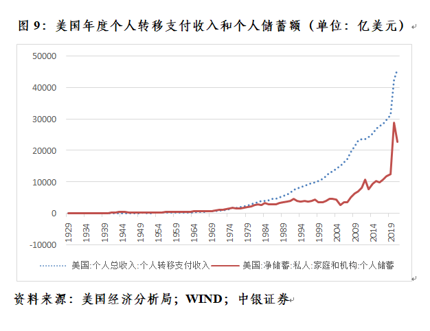 对1934~2021年美国个人转移支付收入和美国净储蓄中的个人储蓄取自然对数,二者相关性分析结果显示为高度正相关0.959。其中,2005~2021年为高度正相关0.978,表明近年来二者的正相关性进一步提高(见图9)。这意味着,随着未来家庭补贴减少,个人转移支付收入下降,个人储蓄也会减少。给定其他条件不变,这将降低美国居民和非营利机构部门的金融资产持有,弱化其资产负债表。
